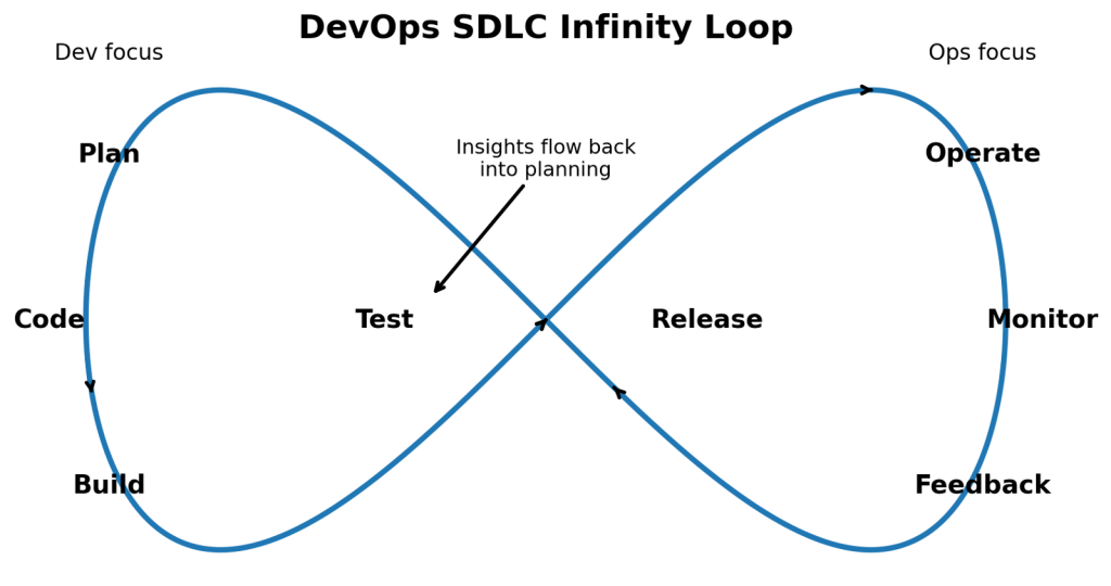 The traditional SDLC stages still exist, but in DevOps, they are tightly linked. Planning is influenced by production feedback, testing happens continuously, deployments are automated and repeatable, and operational data feeds directly into future development decisions.