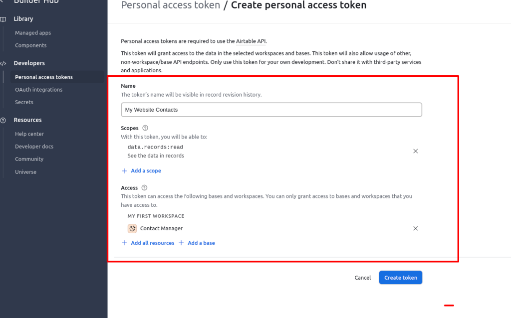 - Generate your Airtable Access Token, Base ID, and Table Name to authenticate securely.