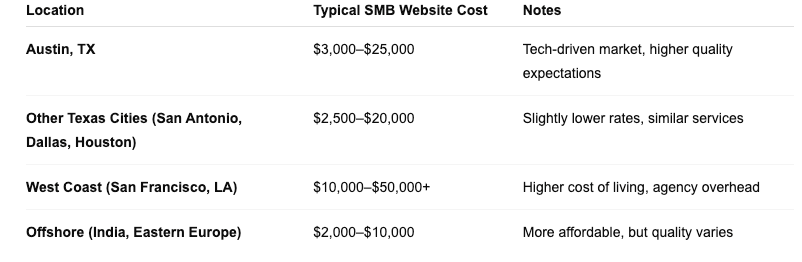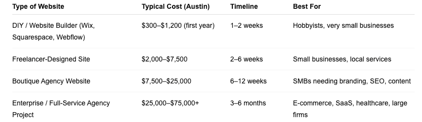 - Basic business websites in Austin start around $3,000, while advanced custom builds can exceed $50,000.
